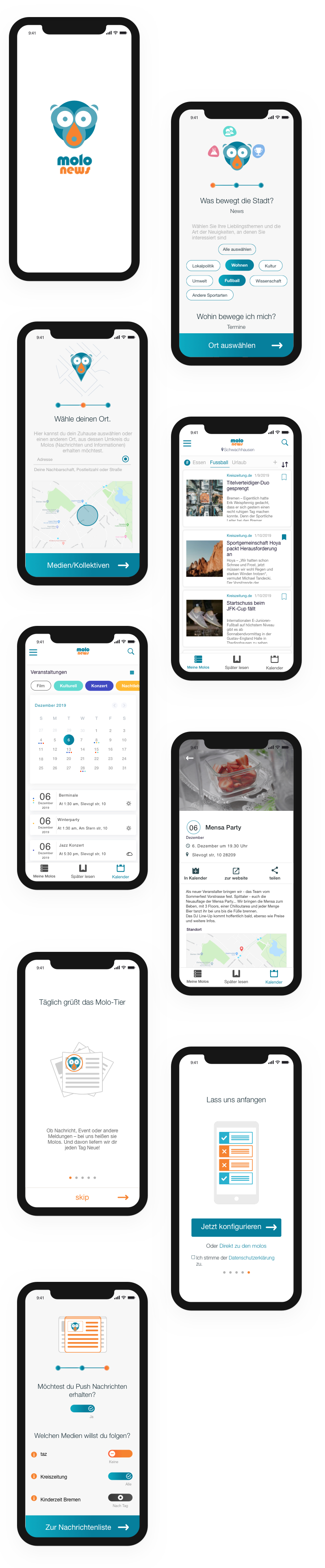 At molo.news, many new molos are released daily, in other words news and events from regional media providers, which are provided with titles, teasers and pictures in a news feed. this content reaches the molo.news editorial via various rss feeds of the media and is curated and published by an editorial staff. particularly important (hot) news is curated in such a way that it reaches all users of the app. besides the molos.news molo.news also creates content of regionally based collective (eg sports clubs, social movements, etc.). these molos are set directly by the collective and published after reviewing the editorial.